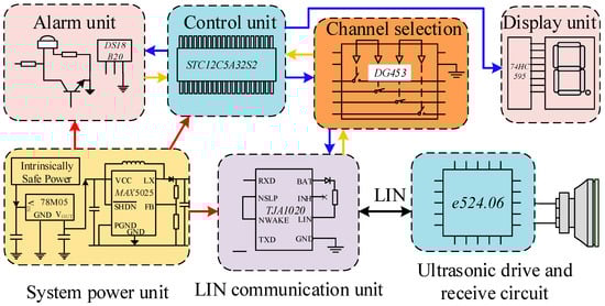 The intrinsically safe transformerless ultrasonic ranging system is shown in Figure 11, and is mainly composed of a power supply unit, a control unit, a channel selection unit, an LIN communication unit, an ultrasonic transceiver unit, an alarm and calibration unit, and a display unit. The system uses STC12C5A32S2 microcontroller as the core of the control unit. The power supply unit is supplied with 18 V voltage from the intrinsically safe power supply (model: CSTI-I). The DC/DC conversion chip 78M05 provides the 5 V voltage required by the system and the MAX5025 generates 12 V voltage to ensure LIN communication. The channel selection unit realizes switching of the output signal of the control unit, and the LIN communication unit completes conversion of the Transistor-Transistor Logic (TTL) level and the LIN level to realize state control and data transmission of the ultrasonic transceiver unit with the e524.06 chip as the core.