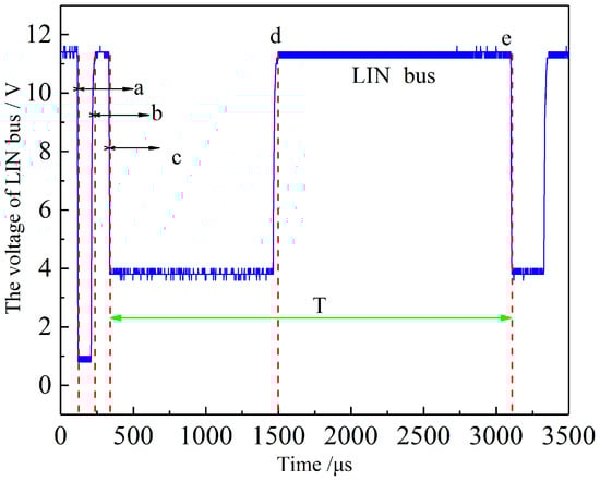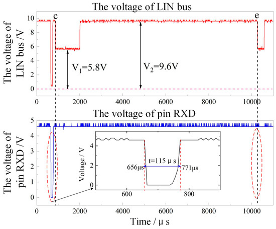 The two curves in Figure 15 are the level changes of the LIN bus and the receive data (RXD) port of the TJA1020 chip when the resistance RLIN in Figure 10 is 1 kΩ, and the controller performs the ranging instruction (before c). The RXD terminal voltage varies with the LIN bus voltage (the dominant level is 115 μs), but at the time c and e, although the ultrasonic transceiver unit replies to the ranging information and the LIN bus generates a level change, the RXD terminal does not. The corresponding reaction is due to the fact that the “low” level of the LIN bus reaches 5.8 V, which exceeds the decision threshold of the TJA1020 for the highest level of the low level, so the hardware circuit needs to be improved.