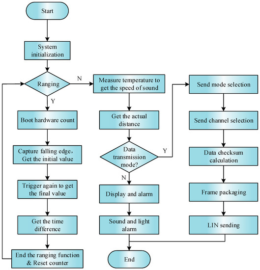 When the ranging is over, the system enters the communication and display module. Firstly, it turns off the capture function of the PCA module, uses the DS18b20 to get the current temperature, and further obtains the sound speed after calibration, and then calculates the current distance based on this. When data transmission is required, the system selects different transmission modes (control mode or acquisition mode), selects channels (single channel or quad channels), and then performs data checksum calculation. On this basis, it is packaged into data frames and sent via the LIN bus. When data transmission is not required, the real-time distance display is directly performed and an audible and visual alarm is performed according to the defined safety value.