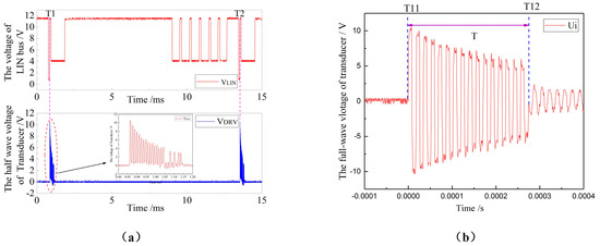 The diagram of ranging command and transducer voltage: (a) the voltage of LIN bus and half-wave voltage of transducer, and (b) the full-wave voltage of transducer.