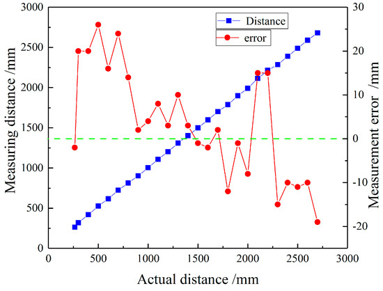 At the same time, in order to determine the maximum and minimum values of the system measurement, the experiment was carried out in steps of 5 mm in the range of 230–260 mm and 2650–2750 mm, and 30 mm was the maximum allowable error limit. The experiment results show that the error would be larger if the distance is less than 245 mm and more than 2705 mm, thus determining the overall measuring range of the system from 250 mm to 2700 mm.