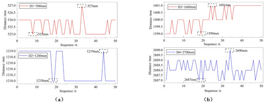 Considering that the system will make larger errors due to other factors such as the external environment in a single measurement, it is necessary to count the multiple measurement results of the system at the same distance to evaluate the stability of the system. Figure 18 shows the measurement results obtained after 50 times of measurements of the system at 500 mm, 1200 mm, 1600 mm and 2700 mm.
