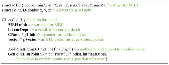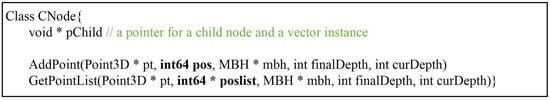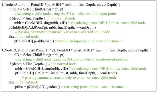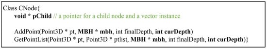 Pseudo codes to implement the steps in C++ language based on the standard template library (STL) are given in Figure 1. The Addpoint method selects a child node of which octant encloses an input point, and updates the MBH of the selected child node. The input point is recursively passed over selected child nodes until the depth of the current node (curDepth) equals the final depth (finalDepth). The final selected leaf node pushes back the pointer (pt) of the input point to a vector archive (pVector). The GetPointList method recursively retrieves child nodes enclosing the position of interest by a similar mechanism, and points can be retrieved from the pVector of the selected leaf node. The size of the node class in Figure 1 is determined by the type of variable used in the MBH. The size of CNode is 60 bytes (= mbh(6 × 8 bytes) + curDepth(4 bytes) + pVector(4 bytes) + pChild(4 bytes)) using double precision or 36 bytes (=mbh(6 × 4 bytes) + depth(4 bytes) + pVector(4 bytes) + pChild(4 bytes)) using single precision. In both cases, a great deal of memory is required during tree construction—estimated to be up to or bytes after n-subdivisions, in the worst case.