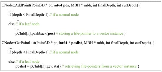 The performance of an octree is strongly influenced by the media where the 3D point cloud practically exists. For the best performance, the 3D point cloud should be loaded into the main memory and stored in an array of Point3D struct, as in Figure 1. A pointer to the struct, instead of the 3D coordinates themselves should be put into the head node and passed over to the child nodes until it can be stored in a leaf node. However, the 3D point cloud itself requires a great deal of memory—sometimes more than the main memory. To avoid defects, octree can be constructed based on file-pointers which directly refer to 3D points stored in a hard disk drive (HDD) or a solid-state drive (SSD). The AddPoint method is revised to pass over a new file-pointer (pos) which refers to the address of an input point in an HDD or a SSD and is finally stored to a leaf node, as shown in Figure 4 and Figure 5. GetPointList is also revised to substitute a new parameter (poslist) for an old one (ptlist) to obtain the queried results in the file-pointer format.