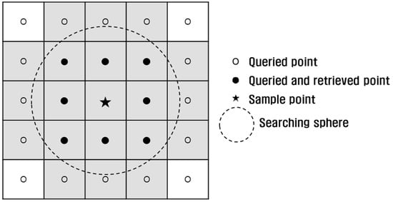 The main memory occupancy and time duration were measured during octree construction. To evaluate the performance, a proximity operation was conducted as introduced in []. This operation aims to query and retrieve neighboring points within a searching sphere from the sample points (Figure 12). Such an operation is known as fixed distance neighbors (FDN) [] and can be applied to k-NN [] if supplemented by distance sorting. The operation is necessary in normal estimation and noise filtering [,]. A total of 3005 sample points, or 1/100,000 of the data, were selected from Data 1 and neighboring points within a 5 cm (radius of the searching sphere) were queried. In all methods, the same 1,735,755 points were retrieved, and thus, no faults were detected in the proximity operation. Likewise, the same operation was conducted using Data 2 and Data 3 (Table 6).
