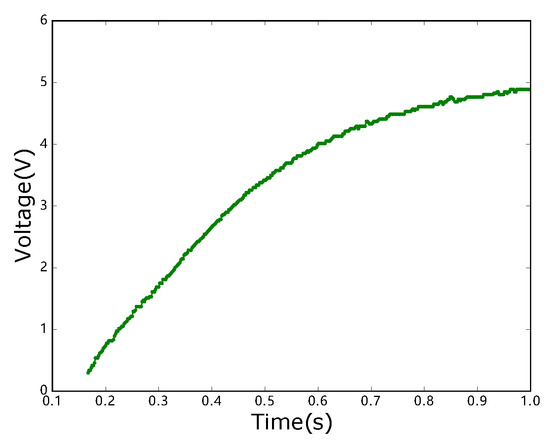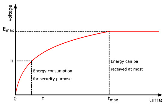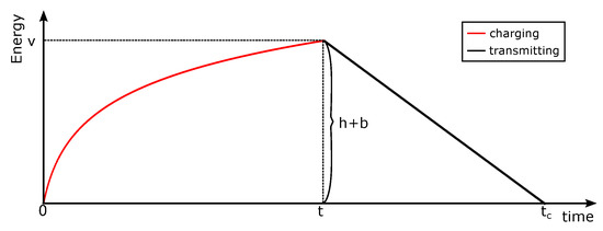 Recently, the technology of wireless power transfer has been used in the area of energy harvesting for IoT and cell networks [12,13,14,15,16,17]. In particular, the authors in [15,16] studied the problem of energy utility in energy harvesting devices and networks. They provided very good solutions that can derive performance within of the optimal when the amount of batter that can be used is . In this paper, we study the problem of data transmission with a capacitor to supply wireless energy while taking into account extra energy consumption. Sensors that apply capacitors to receive wireless energy for data transmission receive a lot of researcher’s focus [18,19,20,21]. The capacitor can receive wireless energy from a wireless signal that is transmitted several meters away. Some researchers start to study the problems of data transmission in IoT devices that utilize capacitors to receive wireless energy [22,23,24]. How to improve the efficiency of the energy utilization is the main problem for sensors that receive wireless energy with capacitors. It has been found that the energy received by the capacitor increases slower and slower as that the sensor gets more and more wireless energy, that is, the energy harvesting rate becomes slower and slower over the energy receiving process [24,25,26,27,28]. Thus, the energy harvesting rate changes over time. When the capacitor is getting full, the energy receiving rate is becoming slower. As shown in Figure 1, the energy received over time is nonlinear and it is getting slower and slower. When energy received by the capacitor gets to , then the capacitor almost cannot receive wireless energy any more.