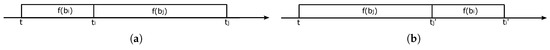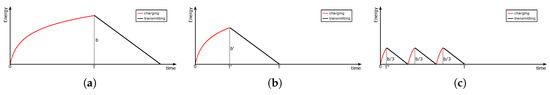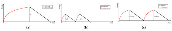 An example is shown in Figure 7, where the wireless energy receiving period is . If the sensor receives energy in the entire period of time as shown in Figure 7a, the sensor will receive energy that can transmit data with size b. If it receives energy during the time as shown in Figure 7b, and the time in is used to transmit data, then it will receive energy to transmit data with size which is much less than b, and the time within is wasted and it cannot receive energy. However, the sensor can also receive energy to transmit data with b when the energy receiving time is much shorter as shown in Figure 7c (In this example, we do not consider the transmission cost of packet header).