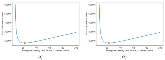 If the sensor has enough energy receiving time, then the problem is how to minimize the total time for transmitting the entire data block with size B. We use an example in Figure 4 to show that there exists an optimal solution for this problem with only a huge data block and the dividing solution can be found through a binary search or Newton’s method. Figure 4 illustrates an example where the wireless energy receiving function is assumed to be , the data size is , and the transmission rate is set to . The energy harvesting function is the energy that the capacitor will receive from the time the capacitor is initially empty. The data size is 1000, which is represented as 1000 units of energy for simplicity; in other words, it will take 1000 units of energy to transmit this block of data. In Figure 4, the x-axis is the time t that the sensor should take to receive energy and then transmit a packet immediately, and the y-axis is the total time it will take to complete the transmission for the whole block of data. From Figure 4a,b, it can be easily found that the minimum completion time is at the position of the red points. The length of the packet header for Figure 4a is 3, which means it will take three units of energy to transmit the packet header for each packet. The length of the packet header for Figure 4b is 5. For Figure 4a, the x-axis for the red point is about 23, and the y-axis is about 17,000, which means that if the sensor always takes about 23 units of time to receive wireless energy, then it uses all the received energy to transmit a segment of data in a packet, then it will take some periods to receive energy and transmit data. After some periods when the entire block of data with size is completely transmitted, the completion time for transmitting this entire block of data is about 17,000 units of time. For Figure 4b, the size of the packet header is 5, the x-axis for the red point is about 90, and the y-axis is about 64,000. Similarly, it denotes that, if the sensor always takes about 90 units of time to receive energy, then uses all the received energy to transmit a segment of data in a packet, after some period, the completion time for transmitting this entire block of data with size 1000 is about 64,000 units of time. We let the energy receiving time (about 23) in Figure 4a and energy receiving time (about 90) in Figure 4b be the optimal energy receiving time that will be used in the later of this paper.