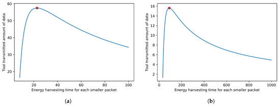 Because the wireless energy receiving time is limited, the problem is to maximize the total amount of data that could be transmitted. Again, we use an example in Figure 8 to show that there exists an optimal solution for this problem and the solution can be found through a binary search or Newton’s method. Figure 8 illustrates an example where the energy harvesting function is assumed to be , the duration length of the energy receiving period that the sensor can receive energy is , and the transmission rate is set to . The energy harvesting function is the energy the capacitor will receive from the time the capacitor is initially empty. The data size is represented as the units of energy for simplicity. In addition, the transmission rate R denotes that it will take units of time to transmit a packet. In Figure 8, the x-axis is the time t that the sensor should take to receive wireless energy and then transmit part of the data immediately, and the y-axis is the total amount of data that the sensor would transmit. From Figure 8a,b, it can be easily found that the maximum total transmitted amount of data is at the position of the red points. The length of the packet header for Figure 8a is 3. The length of the packet header for Figure 8b is 5. For Figure 8a, the x-axis for the red point is about 22 and the y-axis is about 58, which means that, if the sensor always takes about 22 units of time to receive energy and then it begins to transmit data, the most amount of data that the sensor can transmit is about 58 when the entire wireless energy receiving period is . For Figure 8b, the packet header is 5, the x-axis for the red point is about 90, and the y-axis is about 16. Similarly, it denotes that, if the sensor always takes about 90 units of time to receive energy and then begins to transmit data, the data amount that the sensor can transmit at most is about 16 when the entire energy receiving period is . It can be found that there is a point that can get the optimal result as shown in the example. Again, the problem can be solved by Newton’s method, similar to what is stated in Section 3.1.