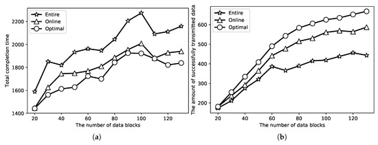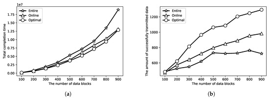 We use an example in Figure 6 to show the proof of Lemma 1. Assume that there are two data blocks with sizes of and , respectively. If we transmit first, then the completion time for and are and , respectively, as shown in Figure 6a, the total completion time is . However, if we transmit first, then the total completion time is as shown in Figure 6b. Because , it has , which represents that transmitting first will not get a worse result.