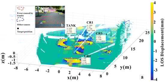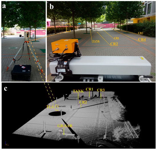 The test site is shown in Figure 2. The scenario was checkerboard-like to conveniently estimate the relative positions of targets. The GB-SAR system was placed on a wheel-less box to fix the antennas at a certain height. The bottom of the box is flat to ensure a stable platform. The scene was mapped using a VZ-2000i TLS (RIEGL Co., Horn, Austria) [25]. About 7.5 million points were collected in each scan after scene segmentation. The TLS station position is shown in Figure 2b,c. Figure 2c shows the relative position between the GB-SAR and each target. The circular vacancy is the “blind area” of the TLS station location scanning, the central position of which is the TLS axis. The main artificial targets are small corner reflectors (CR2, CR3, CR4), a large corner reflector (CR1) displacement test rail, and a black tank (TANK). Reflective stickers serve as strong amplitude points in TLS measurement. CR4 was obscured by a tree trunk in the TLS observation, so it was not identified in the point cloud. CR4 was arranged for geometric mapping validation. Generally, if the 2D image pixels representing CR4 are mapped to 3D space exactly in the shadow zone, the projection results are credible. There were relatively stable natural targets in the site including masonry ground, trunks and a brick wall. To this effect, the test site indirectly simulates the observation of deformation under natural conditions. There is dense vegetation on both sides and the upper part of the image. As shown in Figure 2b, the facade of the buildings on the left and right sides was not covered by the radar azimuth beam. The point cloud of the trunk (Figure 2c) was retained to verify the influence of the trunk swing, although the oscillation frequency is large. Relatively few pedestrians or vehicles passed through the scene during the experiment, so these effects were ignored.