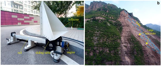 (a) Linear sensor system employed to generate controlled displacement; (b) A mountain rockslide, the movement of corner reflector simulates the displacement of giant rocks on the surface of the rockslide accumulation zone. Blue dashed line shows the LOS direction, and yellow line marks two large size rocks on the slope surface.