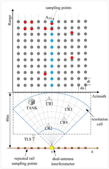 where represents the range of the nth target, denotes the nth target azimuth length to (0,0), and is the intermediate frequency wavelength, , on behalf of the point spread function (PSF), is the impulse response of the imaging system for a low-pass filter point target. The results of Equation (5) not only contain amplitude and phase information, but also represent the physical properties and geometric parameters of the imaging scene. For Figure 4, the grey dot refers to the grid pixels, and the blue dots are the middle axis of the image while the red dots are the ideal pixel positions in the image space of each target in the experiment. Actually, the pixel grid coordinates of the image are usually not consistent with the position of the real surface object; therefore, there is a deviation between the red dot and the grey dot. In the image processing, the azimuth width of the actual observation scene is often longer than the azimuth orbital length L, but the difference is usually small, and zero fill along the azimuth direction is needed for both two conditions [15]. The principle is to ensure an equivalent length of signal along the azimuth between the experiment and the actual situation, otherwise, the azimuth image blurring will occur and affect the SAR image quality. Due to the experiment conducted in the regional observation area with close distance, the attenuation of the electromagnetic wave along distance caused by the changes of observation distance cannot be ignored, and even the image will be defocused seriously. In addition, for natural strong scatterer or artificial object like corner reflector, the energy may diffuse in the image space, and the phenomenon of relatively longer extension length in the azimuth and the relatively diffused that in the distance direction, in which the artifact will be produced, the experiment to test artefact as shown in Figure 5.