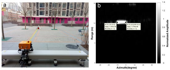 where Rref is the distance between the scene center point and the phase center (red point in Figure 5a), and is an approximation. In the experiment, was about 22 cm and was 30 cm. represents the pixel complex value, where is the range and a is the azimuth. can be denoted as: