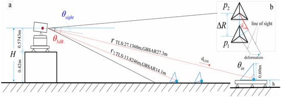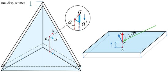 where a, b, c, d are all undetermined coefficients ; ; ; , “dot” means dot product, denotes for a vector and inside components. Then go on with a geometrical relationship analysis, as shown in Figure 12, the above right side of CR1 and ground tiles was fitted by the above method and two groups of data before and after CR1 movement were obtained by TLS scanning. The gravity center or isosceles right triangle of the two CR1 planes is and , and the vector is the real deformation to be solved. Let be the vertical projection of onto the moved plane (blue colored), is the distance between two parallel planes, and is the angle between the true displacement direction and two parallel planes. When CR1 was placed parallel to the ground, plane was parallel to the bottom, was 45°, and . Similarly, for the floor tiles, which are closely arranged, the tiles can be considered only deformed in the vertical direction. and are the gravity center, and the LOS displacement for GB-SAR was , represents the LOS incident angle for and , which can be calculated from the point cloud according to Figure 10.