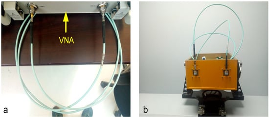 Phase stability test. (a) Testing cable delay and bending degree of cable with VNA; (b) The same cable will transmit interferometer directly to the receiving end for continuous sending and receiving multiple groups for phase stability test.