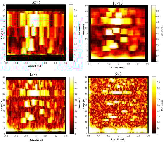 Different coherence window calculation size was tested. For example, “35 × 5” means in the range direction 35 pixels and in 5 pixels in the azimuth direction were used to calculate coherence via Equation (9).