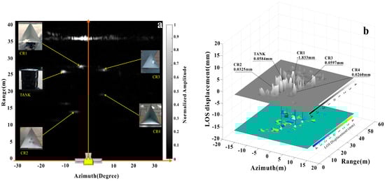 Outdoor experimental scheme, as shown in Figure 1. Artificial targets were placed 10 m away from the GB-SAR, mainly including four CRs, a linear rail (about 30 m from GB-SAR), and a tank. Reflective stickers were pasted on the side-walls and each CR vertex (except for CR4). Two more stickers were placed on the middle of each transmitting and receiving antenna aperture, and then the antennas were motored back to the initial rail location. We used the TLS to scan the scenario once, then moved the antennas to the rail terminal and ran the TLS again. We next co-registered the TLS point clouds using control points to establish the surface model (DSM) and a sticker recognition algorithm to identify the target and control point coordinates. We ran the GB-SAR repeatedly in 10 min intervals to obtain 2D complex imaging figures, coherent figures, and interferograms all in time series. When the GB-SAR was paused, the CR1 rail generated linear displacement under software control and recorded the displacement measured by the rail sensor. The TLS also scanned the scene at the same interval. Interferograms were projected onto the DSM and evolved into 3D deformation maps as we calculated the displacement in the time series of each feature point by surface fitting. Finally, we integrated the TLS displacements and rail sensor results to accomplish coherent scatterers and final filter processing.