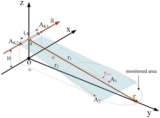 After calibration of the rail, the axis was approximately parallel to the ground. Point cloud data was obtained by TLS topographic mapping. GB-SAR system coordinates were determined as described in Section 2, with accuracy over 50 m of about ±1 mm [20]. is the phase center of the GB-SAR array and is the cross section by range and azimuth direction. The plane rotates around the s − a axis as the target range changes. is the rail axis distance to o − xy. We took the plane formed by the central point slant distance of the test site and the s − a axis as the reference plane for imaging. The obtained image is the projection image of each target in the reference plane. In the geometric mapping method, corresponds to In SAR image, , respectively correspond to , ; the problem to be solved is a mapping relation. As shown in Figure 10, , are the slant ranges between , and . , are the projection points on the s − a axis. The point cloud spatial resolution is higher than that of the GB-SAR image, with a multiple-to-one mapping relation. The range coordinates of SAR images are all positive, so the range direction matching relation is as follows:
