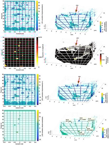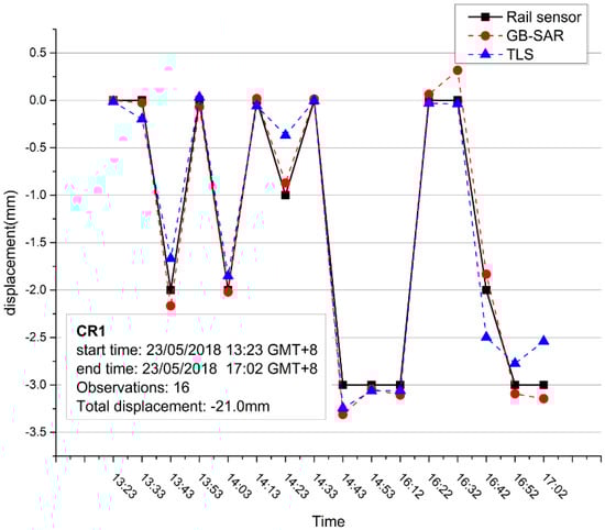 Table 3 shows the GB-SAR and TLS comparison at P1 and P2 calculated upon method mentioned above, which we P1 and P2 were shown in Figure 11a. Undoubtedly, they should with very small cumulative displacement. However, as shown in Figure 13, the GB-SAR results accord well with the rail sensor values. And GB-SAR accuracy is slightly higher than the TLS measurement at CR1:GB-SAR average error is 0.01687 mm and TLS average error is 0.03881 mm. In this case, if some areas are stable and possess coherence as high as the CRs in lengthy time series, they will produce high signal-to-noise (SNR) echo and become “coherent scatterers”, surely merit credible measured value.