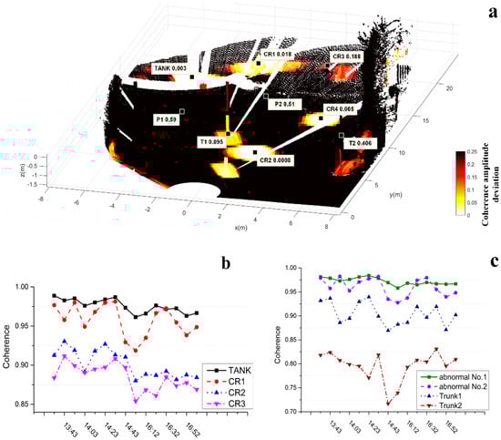 3D coherence analysis (a) DA map projected to point cloud, colors identify the DA less than 0.25. DA values of some points corresponding to points in (b,c) are shown. (b) Coherence curve of artificial targets over time; (c) Anomalous areas in Figure 7 where coherence changes with time, abnormal No. 1 and abnormal No. 2 correspond to P1 and P2 in panel (a).