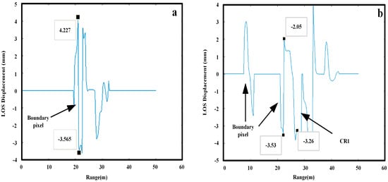 1D profiles including abnormal discontinuous boundary and CR1. The abnormal bumps are in the range direction of the displacement map (a) An example profile contains boundary pixel; (b) Profile contains boundary pixel and CR1.