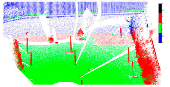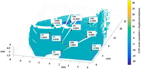 Compared with the method that the PS point was selected based on the two-dimensional image [29], while coherent scatters are selected in this paper to select the PS the point through point cloud classification. The accurate classification of the point cloud is the process of identifying the attributes of the point cloud which is of great significance in improving the reliability and automation of the modeling process. This paper also classifies the point cloud as shown in Figure 18. RANSAC algorithm is mainly used in this process [34], which is divided into three processes: point cloud acquisition, point cloud segmentation and point cloud classification. The point cloud segmentation mainly divides the main monitoring targets and selects coherent scatters from these target point clouds (red areas). Through the accurate segmentation of the point clouds, CR1 and TANK can be separated from the nearby ground, which will not be described in detail here. Only the initial automatic classification result of the point cloud is displayed here. The red color is the area where the coherent scatter point is to be selected, the green area is the ground, and the blue and black correspond to the unclassified result.