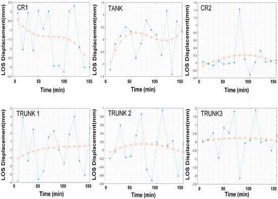 Figure 17 shows the dashed line (blue) of GB-SAR measurements at points CR1, CR2, TANK, T1, T2, and T3 as well as the third-order polynomial fitting curve (orange colored). The CR2 and TANK variables were consistent with our predictions. The CR2 data moved slightly in a certain track which is indicated as a sharp peak in the graph. Time series displacements at T1, T2 and T3 was positive and negative, respectively.
