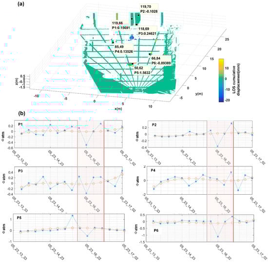 (a) For the GCP points selected based on the DA < 0.1 and only on the artificial target, there are 6 in total, among which the displacement of P5 points is artificially shifted at a certain moment. (b) In the red color frame, it was found that each GCP point had a strong correlation, and the atmospheric disturbance occurred during this period was comprehensively determined. The farther away from GB-SAR, the more severe the target disturbance, indicating that the atmospheric disturbance in the small region was more consistent, and it could be considered that it changed linearly with distance.