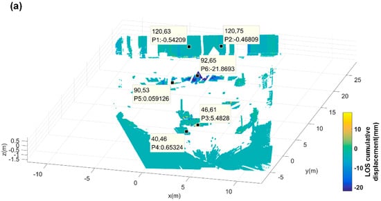 Linear filtering is utilized to reduce boundary discontinuity or boundary anomaly pixels to prevent error accumulation in longer time series. Uniform sized windows of 3 × 3, 5 × 5, 7 × 7, and 9 × 9 were separately tested. Oversized window may affect the observation value at CR1, but undersized window is insufficient to filter abnormal values. The total cumulative deformation measurements of 15 data sets at each point (mm) are shown in Figure 16, the artificial targets and the trunks work as natural targets total cumulative displacements were labeled out. There were still displacements around P1 and P2 points that may be attributable to pedestrians crossing through the experimental setup, but they deformed slightly.