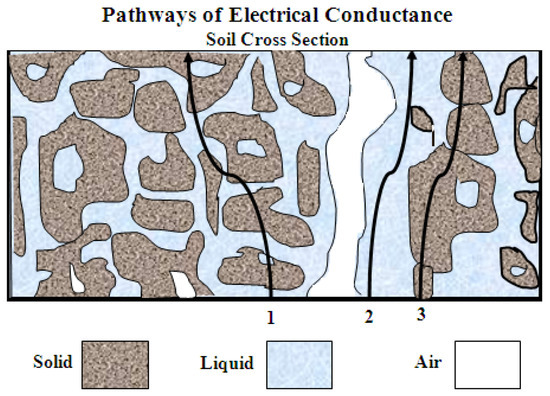 According to Wyllie and Southwick [11], three conductance pathways, see Figure 1, contribute to the σb of a soil: (i) solid phase pathway through soil particles that are continuous contact with one another, (ii) liquid phase pathway through dissolved ions in the soil water inhabiting the large pores, and (iii) a liquid–solid interphase pathway through exchangeable cations like surfaces of clay minerals. Electrical conductivity (EC) in the liquid phase (σp) is used to estimate the soil salinity, a high EC refers to a high concentration of soluble salts, and vice versa. The σp could be estimated if the relationship between σp, σb, and water content (θ) is fixed [12,13,14]. The discovered linear correlation between the soil relative dielectric permittivity (εb) and σb values [15] enabled Hilhorst [3] to convert σb to σp by using a theoretical model. According to Hilhorst, σp can be determined from the equation: