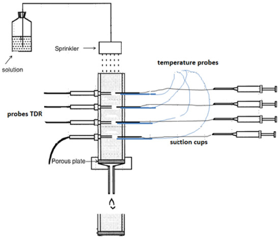 To achieve the objective of this study, we used two soil columns with a height of 55 cm provided by a sprinkler, see Figure 2. The lower boundary was controlled using a vacuum pump at a constant pressure head of −30 hPa. The columns were packed with a density of 1.4 g/cm3. The substrate was sand, 80% of which was fine sand. The water content during packing was approximately 4 m3/m3. The TDR and soil temperatures sensors were installed in four depths: 7, 21, 35, and 48 cm. Since the soil is sand, the soil relative dielectric permittivity (εb), bulk electrical conductivity (σb), and temperature were measured every 5 min to obtain enough observations for modeling.