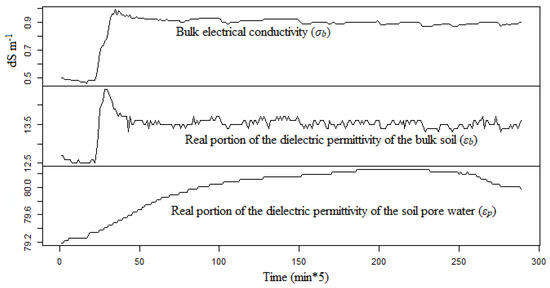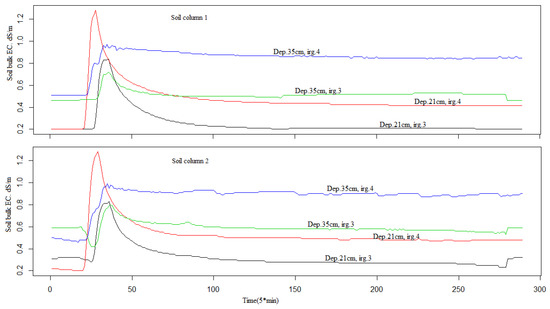 The reason for choosing 1 l/h for the irrigation rate and 5 min for the irrigation interval is visualized in Figure 3. At each depth, we could see how the bulk electrical conductivity responds to the irrigation event.