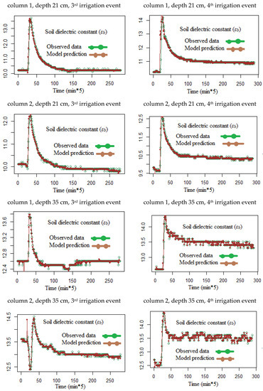 Observed and predicted soil relative dielectric permittivities according to the soil column number, depth, and irrigation event.