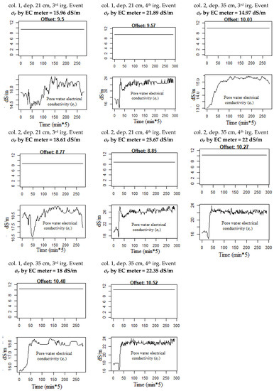 Since the prediction of the soil relative dielectric permittivity (εb) is valid, the estimation of the electrical conductivity of pore water (σp) and the offset εσb = 0, see Equation (7), are also valid because they are used in the prediction of the soil relative dielectric permittivity (εb) and have converged to their true values. The evolution of σp over time obtained by DLM is presented in Figure 6; it shows the importance of using DLM because it obtained all the changes of σp over time and not a single value of σp for the entire data set. Another interesting aspect is that Figure 6 shows the changes in the model offset for each irrigation event at each depth. This finding is very important since it shows that the offset does not depend on the soil type [10,14,15,16] nor on the soil type and salinity [17] when two columns with the same type soil are used, as in this study. Moreover, in Figure 6 we put the corresponding value of σp measured by the EC meter device for each depth according the irrigation event and soil column number.