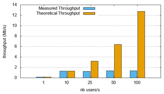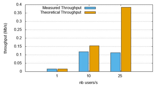 - node1 was easily able to manage the load when 1 user/s was created (i.e., a throughput equal to 0.013 Mb/s); as each user generated only one request, the server needed to handle only one frame per user at a time (i.e., a traffic load—request + response—equal to 1924 bytes). When the number of users was increased to 10 and 25 users/s, the measured throughput was approximately 0.03 Mb/s, that is, less than the theoretical throughput (around 0.15 Mb/s). In addition, the error rate was significant with 10 users/s, and 100% with 25 users/s. In those specific cases, the server was not able to manage the load. This could be explained by the fact that (i) the server could not manage the backlog (this especially might have been the case, since the server needed to send another HTTP request to the OpenDataSoft platform), (ii) the service could have been unavailable at that time, or even (iii) the university infrastructure could have limited the authorized bandwidth. Overall, node1 was able to manage a maximum throughput of around 0.013 Mb/s. Note that the version of the node itself is an old version, which is not even available on Github (version 0.9.2).