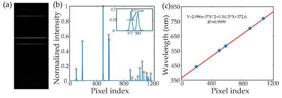 Calibration of the in-house fabricated spectrometer with a calibration source (HG-1 calibration source, Ocean Optics). (a) Calibration image. (b) Peak distribution. (c) The calibration curve.