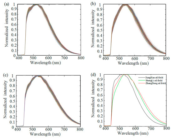 The seven samples listed in Table 1 were used for type classification and distribution analysis. By scanning the sample with the motorized linear stage, the hyperspectral data of the sample were obtained. The sample stage was moved at a speed of 20 mm/s, and a picture with an exposure time of 100 ms was captured every 50 μm. In total, 400 pictures were captured for each sample. Figure 4 shows the normalized spectra and averaged normalized spectra of the three types of crude oil at each pixel. As can be seen in Figure 4a–c, the spectra of different types of crude oil are close to identical at different spatial positions. However, as can be seen in Figure 4d, the averaged normalized spectra of the three types of crude oil are quite different from each other, indicating the possibility to identify the types of oil samples through fluorescence. The peak wavelength of Crude Oil 1 is around 510 nm, which is shorter than those of the other two samples, and the normalized fluorescence intensity of Crude Oil 3 is larger than that of Crude Oil 2 at around 525 nm. These features can be combined to determine the type of crude oil. It should be noticed that these features were obtained without the intensity calibration, after which they can be seen more clearly.