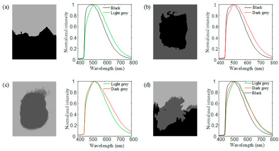 Following this, K-means clustering was applied for each pixel. Pixels of the same type were marked with the same color, yielding spatial distributions as shown in Figure 5. Regions marked with different colors represent different types of crude oil. Black color represents Crude Oil 1, light gray color represents Crude Oil 2, and dark gray represents Crude Oil 3. Referring to the sample composition descriptions in Table 1, we can conclude that the analysis of the spatial distribution of samples is correct.