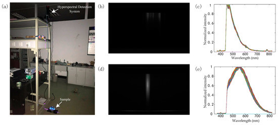 In order to test the feasibility of the system in open space, we made a trial test in the laboratory. The fluorescent hyperspectral detection system was put above a 2.2 m high shelf while the sample was on the ground, as shown in Figure 7a. The samples chosen were Crude Oil 1 with an exposure time of 10 s and diesel oil with an exposure time of 3 s. It can be seen, though with limited excitation power (200 mW) and a cheap CMOS camera, that the system was able to obtain spectra of high quality. Thus, we believe that the system has the potential to be used in detection in open space.