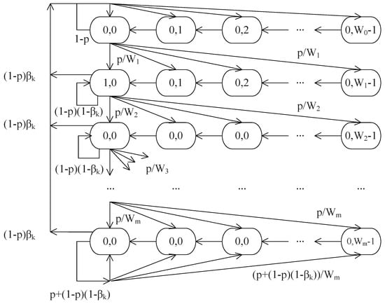 Two-dimensional Markov Chain is used in this section to analyze the proposed algorithm. Let express the backoff state of the node. In the formula, i is the backoff stage, which is the double times of the node’s contention window, in BEB or in QB; j is the value of the backoff window at the current time, . It can be found that the node’s backoff state space is . Let express the backoff state of the node at the moment t, define the transition probability as