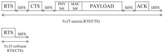 In the formula, is the expectation of the payload length of the data. and are the average channel occupied time when the data transmitted successfully or failed respectively. is the probability that there is at least one node sending data at any time, . is the probability that there is only one node sends data, . The diagram of and are shown in Figure 3. As in the vehicular adhoc network, if the distance between two vehicles is more than one-hop range and less than two-hop range, when they both transmit data to the same node in their one-hop neighbor list, a hidden terminal problem happens. Using RTS/CTS protocol, these two nodes can monitor the collision when they cannot receive the CTS and will not waste time to transmit data.
