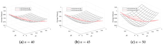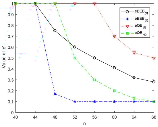 Figure 5 shows the optimal value of both in the enhanced BEB and enhanced QB. In order to make the image simple and clear, there are two kinds of data in the simulation, so two parameters and need to be solved. Assuming that the delay requirement of data 1 is , and the delay requirement of data 2 is . As the priority of data 1 is higher than data 2, the assumed parameters . Both in the enhanced BEB and QB, we can find that is always larger than , because the delay requirement of data 1 is higher than data 2. To meet this requirement, the data 1 needs higher probability to reset the backoff stage to 0 compared with the data 2, so . In the enhanced BEB, the decreases when . On the other hand, in the enhanced QB, the decreases when , which conforms to Figure 4. For the same optimization target and system parameters, when the number of nodes in the network increases, the network load and transmission collision probability increase. In order to reduce the data transmission conflict and transmission delay, will reduce accordingly, so the node will choose the contention window at the higher backoff stage to reduce the transmission probability. In particular, although the data 2 make a concession as their priority are lower, has a lower limit because their delay has constraints.