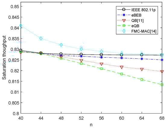 Figure 6 shows the saturated throughput performance of the proposed algorithm compared with the IEEE 802.11p, QB algorithm and FMC-MAC. The system throughput decreases along with the increasing number of nodes. This is because when the system parameters are given, the probability of the transmission collision increases with the increasing number of nodes, which reduces the system throughput. It can be seen in the figure that the saturated throughput of IEEE 802.11p algorithm does not decrease significantly. The reason is that the saturated throughput is the maximum throughput that can be reached when the number of nodes is given, without considering the limitation of maximum backoff stage and initial contention window on the data transmission probability. So if the system gives the number of nodes, maximum backoff stage m and initial contention window , the saturated throughput is not always reachable. Because of lack of flexibility, in some special networks, the actual throughput will be much less than the saturated throughput. The saturated throughput of the FMC-MAC [] protocol is higher than the standard IEEE 802.11p. Because they allocate more resources for non-safety applications when the resources are enough for allocation, they fail to guarantee the reliability of safety applications. After using the adaptive backoff algorithm, the actual throughput is less than the theoretical achievable saturated throughput, but the losing performance is not much, and the actual throughput is larger than 90% saturated throughput.