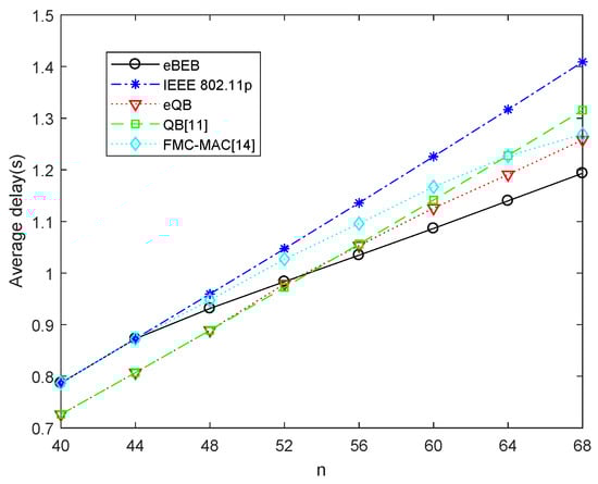 Figure 4 shows the average total delay with the different number of vehicles. By comparing Figure 4a–c, it can be seen intuitively that the average total delay increases with the increasing number of vehicles. In addition, we can find that when the number of vehicles is smaller (), the lowest delay can be obtained at , which are the same as the BEB and QB algorithm. While when the road is crowed ( ), the original backoff models like the BEB or QB model cannot satisfy the request of mass data transmission, the performance becomes poor because the transmission collisions increase. By using the adaptive backoff scheme, we can adjust the backoff parameters of different kinds of data, like and in the Figure 4. In this way, the average total delay decreases with the less transmission collisions. The adaptive backoff scheme is helpful to both EBE and QB algorithm. In particular, without the adaptive backoff scheme, the QB algorithm is better than BEB algorithm. While after using the adaptive backoff scheme, the performance of the enhanced BEB algorithm is better than the enhanced QB algorithm. So this adaptive backoff scheme is more suitable for the BEB algorithm.