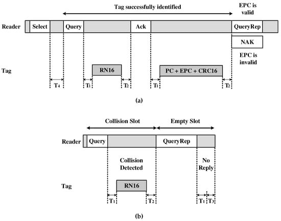 For a given time slot, there are possibilities: successful slot, when the tag is successfully identified; slot in collision, when two or more tags competed for the same time interval; and empty slot, when there is no transmission (see Figure 2a,b). When a slot or tag is successfully identified, the reader acknowledges the tag with an . Then, the tag transmits its 96-bit EPC to the reader. If there is a collision of RN16, hence no tag identified, the reader finishes the transmission time interval, checks all time slots of frame , and starts a new round of Query transmissions with a new Q updated.
