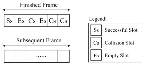 In the literature, there are several studies for DFSA estimators, including Chen [12], Eom-Lee [9], Vogt [11] and Schoute [10], which will be discussed below. For this, we consider an operation example of DFSA algorithm, depicted in Figure 3. There are two frames of interest, the finished frame, and the subsequent frame. The finished frame represents the number of labels that competed for slots in that frame, where , and correspond to the number of successful slots, empty slots, and colliding slots, respectively.