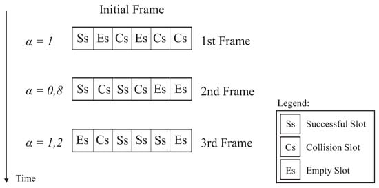 Figure 4 exemplifies the ageing factor process, where the initial frame starts with . Since in the past there was any frame, so the second frame will receive penalizing factor of . By calculating the average successful slots in the second frame, the third frame will be rewarded with .