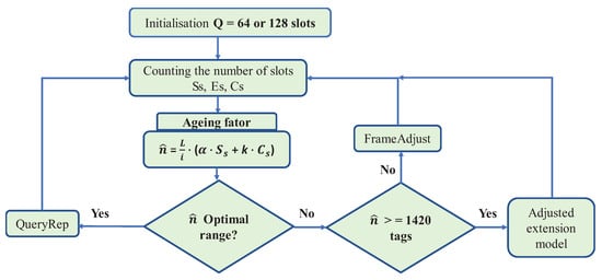 The proposed anti-collision protocol is shown in Figure 5. At first, the reader begins a reading cycle of tags, broadcasting a query command Q for all tags within the its coverage area. This command corresponds to frame length , meaning that there are intervals in the current reading frame. Thus, in the last time slot, the reader starts recording the number of empty slots , the number of slots successfully identified , and the number of slots in collision . An estimated number of labels is then generated to be read at the beginning of the reading cycle according to Equation (17):