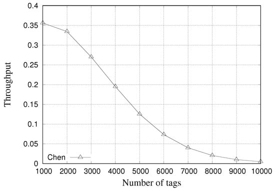 However, Chen estimator is only able to efficiently estimate if the maximum number of labels is up to 1420 tags. Above that, the estimator loses performance since it estimates a wrong length for next frame to accommodate such tag population. Figure 6 illustrates Chen estimator performance, where it can be seen the throughput worsen as the number of tags increase. Thus, Chen estimator is not adequate to estimate a huge number of tags.